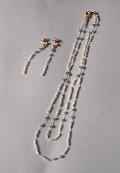 100%絹糸を使用し、淡水パールとアベンチュリンで2連のネックレスに仕上げました。